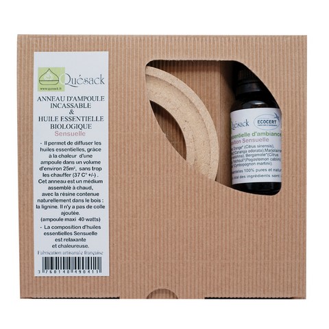 L'anneau est fabriqué en médium PXD, matériau crée avec 100% de fibres de bois non traitées, collées avec sa propre résine, la lignine(sans colle ajoutée). Les huiles essentielles sont certifiées Parfums d'Ambiance Biologiques par Ecocert.