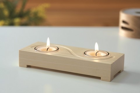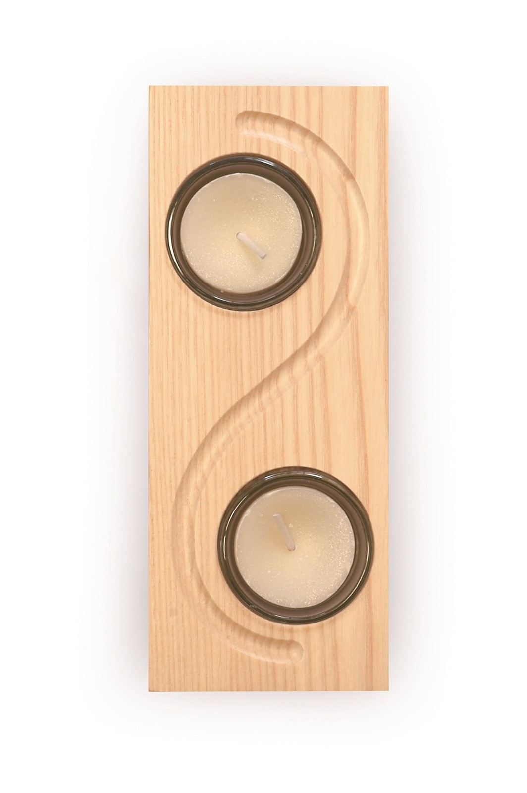 Bougeoir en bois de frêne massif, il est équipé de deux godet en verre pour brûler les bougies en toute sécurité. Il mesure 184 mm de long, 74 mm de large et 32 mm de haut.