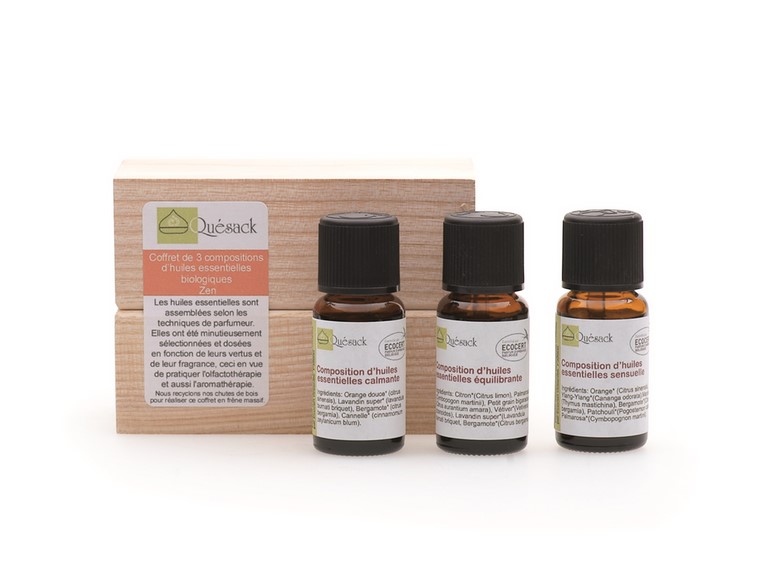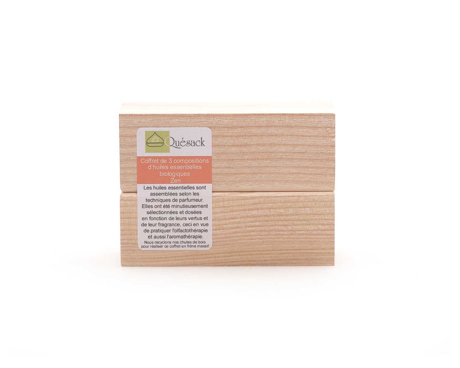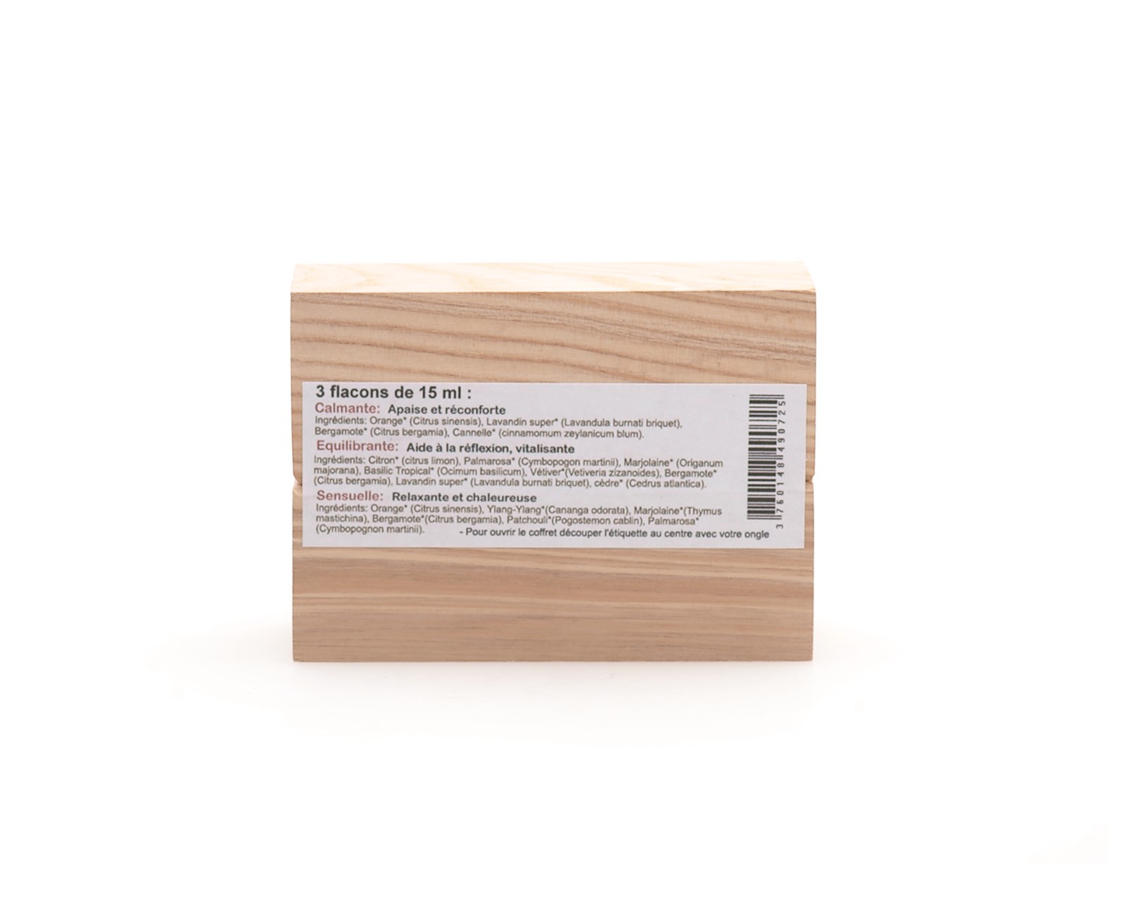 Coffret Zen avec trois compositions d'huiles essentielles biologiques (le flacon est d'une contenance de 15ml)