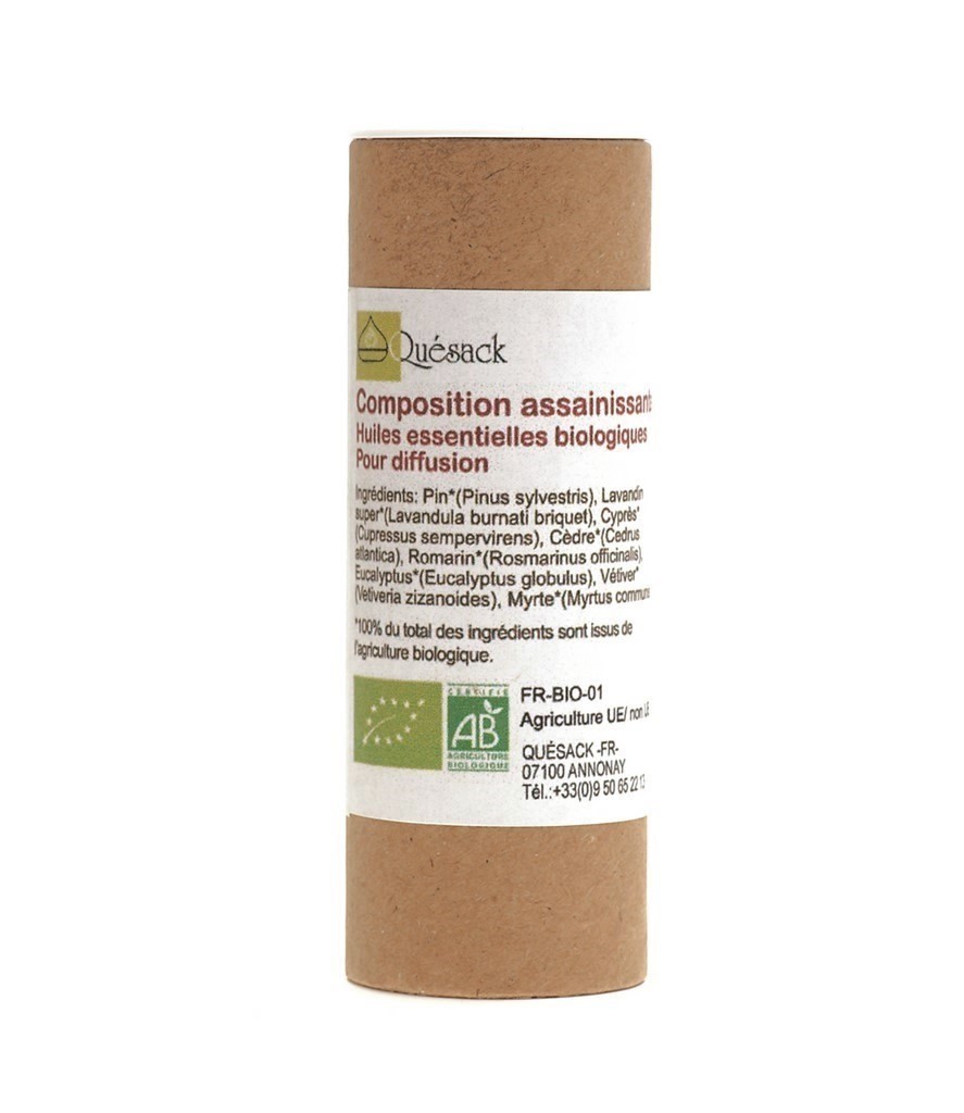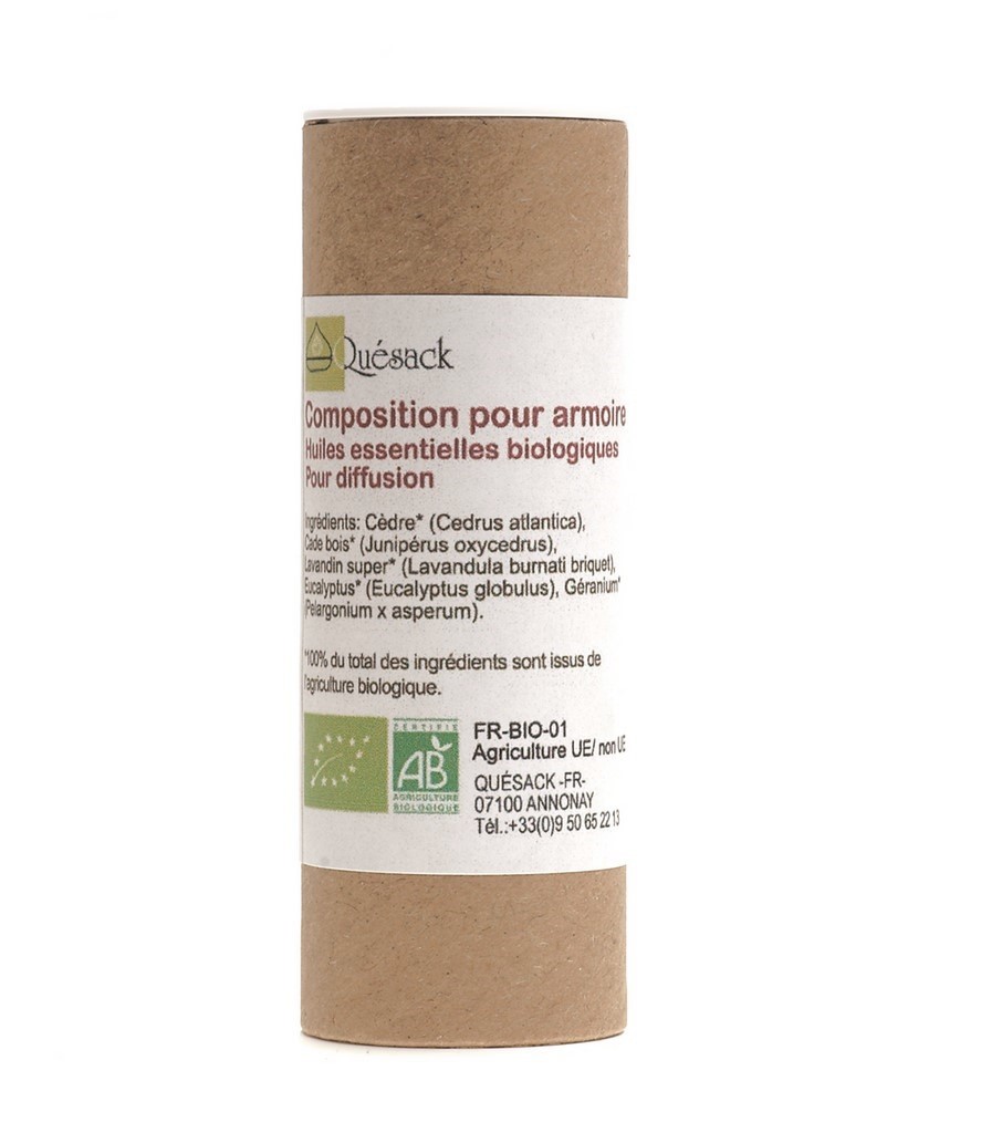 Ingédients : Cèdre* (cedrus atlantica), Cade bois* (Junipérus oxycedrus), Lavandin super* (Lavandula burnati briquet), Géranium* (Perlargonium x asperum), Eucalyptus* (eucalyptus globulus).