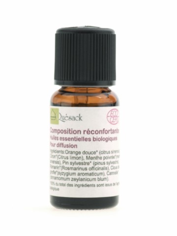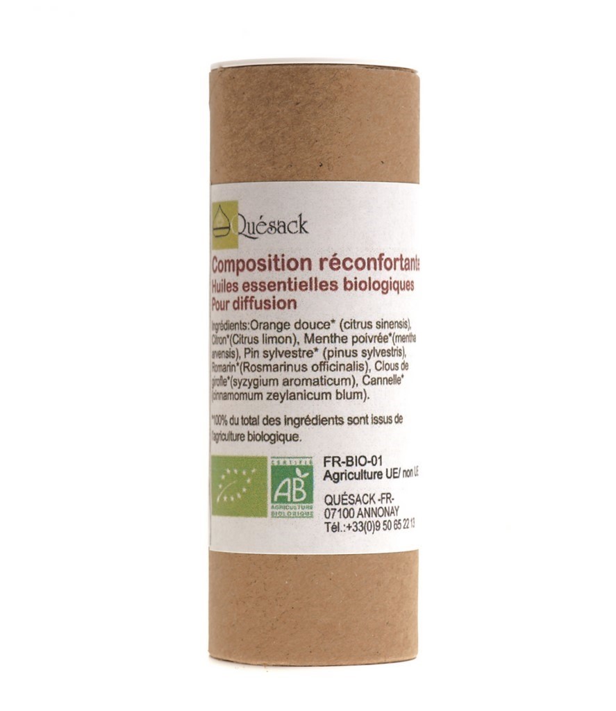 Ingrédients : Orange douce* (citrus sinensis), Clous de girofle* (syzygium aromaticum), Cannelle* (cinnamomum zeylanicum blum), Pin sylvestre* (pinus sylvestris), Romarin* (rosmarinus officinalis), Citron* (citrus limon), Menthe poivrée* (mentha arvensis).