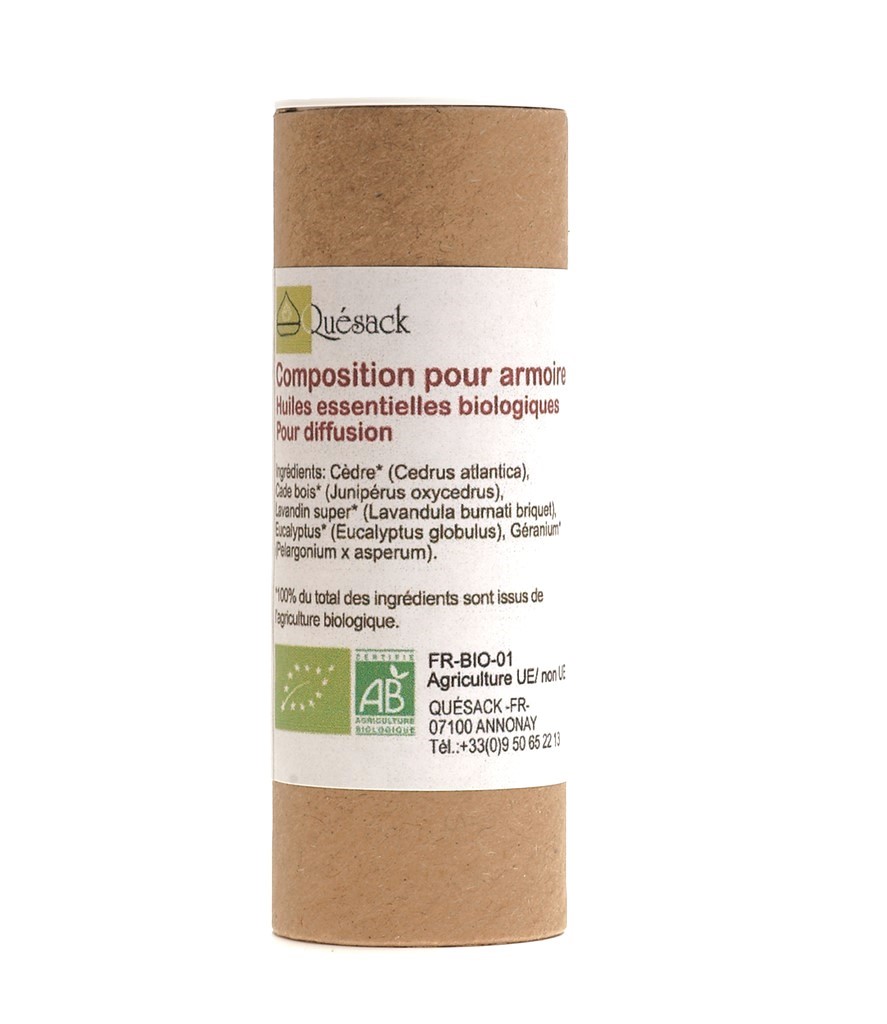 Cèdre* (cedrus atlantica), Cade bois* (Junipérus oxycedrus), Lavandin super* (Lavandula burnati briquet), Géranium* (Perlargonium x asperum), Eucalyptus* (eucalyptus globulus).