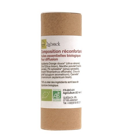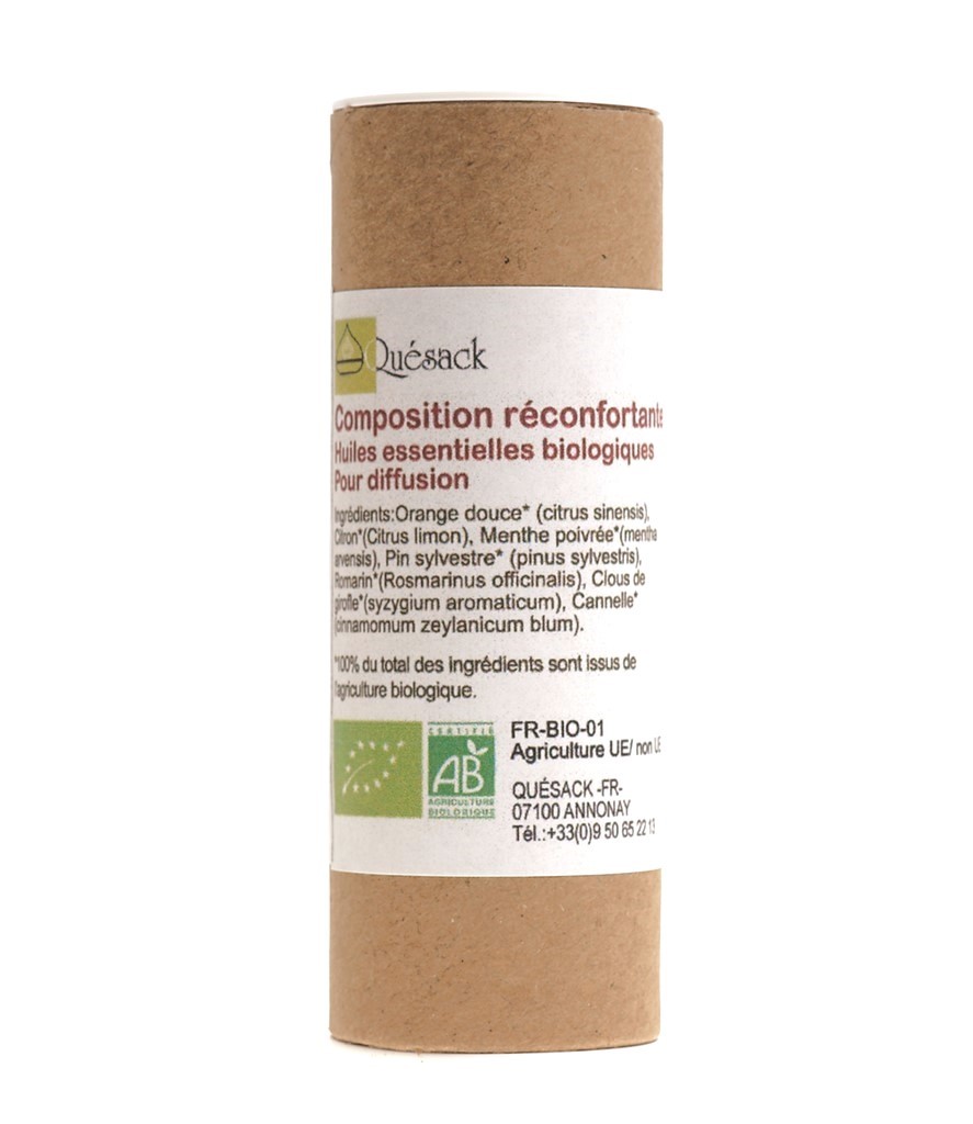Ingrédients : Orange douce* (citrus sinensis), Clous de girofle* (syzygium aromaticum), Cannelle* (cinnamomum zeylanicum blum), Pin sylvestre* (pinus sylvestris), Romarin* (rosmarinus officinalis), Citron* (citrus limon), Menthe poivrée* (mentha arvensis).