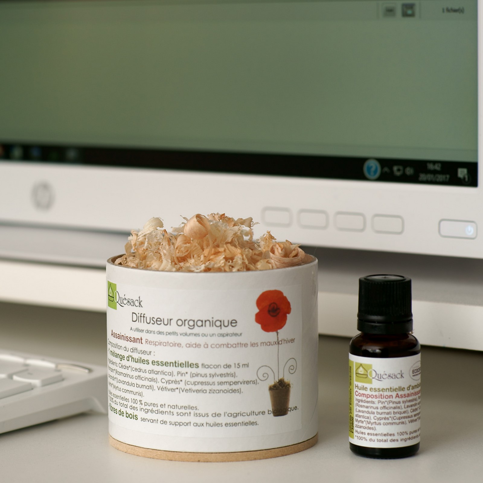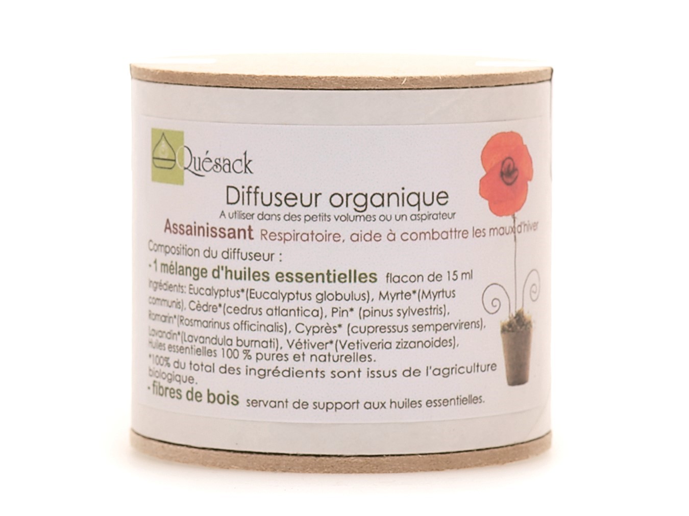 - Fibres de bois servant de support aux huiles essentielles.